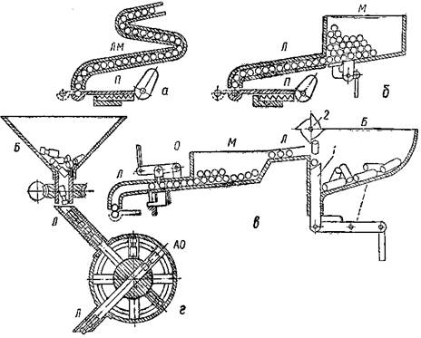 Загрузочные приспособления могут состоять из одних лотков, в которых изделия перемещаются самотеком непосредственно в зону обработки, как это имеет место, например, в бесцентрово – шлифовальных станках. При некотором усложнении к лотковым магазинам ЛМ (рис. 1, а) добавляют питатель П, действующий синхронно с другими исполнительными органами станка, т. Е. связанный с рабочим циклом станка. Этот питатель выбирает из выходного отверстия лотка по одной заготовке и подает ее в зону обработки.