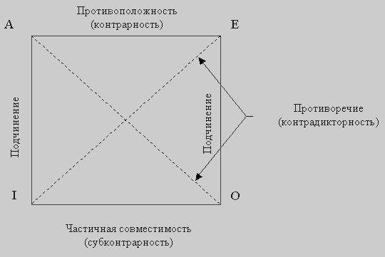 Для иллюстрации отношений между простыми суждениями используется логический квадрат[2] :