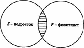 1. В суждении “Некоторые подростки - филателисты” термины такие: S - “подросток”, Р - “филателист”, квантор существования - “некоторые”. Соотношение S и Р изображено на рис. 4.