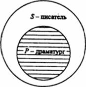 2. В суждении “Некоторые писатели - драматурги” термины такие: S- “писатель”, Р - “драматург” и квантор существования -“некоторые”. Субъект не распределен, так как в нем мыслится только часть писателей, т. е. объем субъекта лишь частично включается в объем предиката. Предикат распределен, ибо объем предиката полностью входит в объем субъекта (рис. 5). Таким образом,