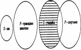 Суждение О - частноотрицатеяьное. Его структура: “Некоторые S не суть Р”. Например: “Некоторые учащиеся не являются спортсменами”. В нем такие термины: S - “учащийся”, Р -“спортсмен” и квантор существования - “некоторые”. Субъект не распределен, так как мыслится лишь часть учащихся, а предикат распределен, ибо в нем мыслятся все спортсмены, ни один из которых не включен в ту часть учащихся, которая мыслится в субъекте (рис. 7).