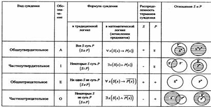 Распределенность терминов в категорических суждениях можно выразить в виде схемы[10] , где знаком “+” выражена распределенность термина, а знаком “-” его нераспределенность. В ней же дана объединенная информация о простых суждениях.