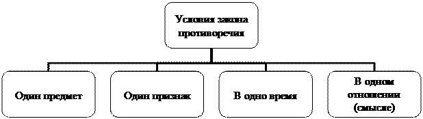 При логическом правильном мышлении наши рассуждения, отражающие самые глубокие противоречия предметного мира, остаются непротиворечивыми. Существование реальных противоречий не нарушает законов формальной логики - о противоречивых процессах необходимо мыслить непротиворечиво, логически правильно. При этом важно знать и соблюдать на практике условия закона противоречия (см. сх. №1)1. в процессе мышления необходимо утверждать принадлежность предмету (явлению) одного признака и в то же время отрицать принадлежность данному предмету (явлению) другого признака. Именно в таких обстоятельствах у человека в процессе мышления не будет логического противоречия. Например: "К. Симонов является автором книги "Живые и мертвые" и "К. Симонов не является автором книги "Блокада". Второй пример: "Всесовременные американские авианосцы имеют мощную противоракетную защиту" и "Ни один современный американский авианосец не имеет наклонной взлетно- посадочной полосы";2. противоречия между суждениями не будет, если в ходе мыслительного процесса рассматриваются различные предметы (или явления).Например: "Петров читает повесть А.С. Пушкина "Дубровский" и "Иванов читает поэму А. Блока "Двенадцать";3. противоречия не будет, если в ходе мышления что-либо утверждается и в то же время отрицается относительного одного предмета(явления), но рассматриваемого в различное время. Возьмем пример, основанный на анализе преподавателем ответа обучаемого в начале и в конце экзамена. Преподаватель может сказать: "Ответ Николаева был неточным" и "Ответ Николаева был верным, точным и доказательным";4. противоречия в суждении не будет, если один и тот же предмет (явление) нашей мысли рассматривается в различных отношениях. Например: "Николай Слесарев - перворазрядник (по гимнастике)" и "Николай Слесарев не является перворазрядником (по боксу)" В данном случае противоречия не будет, так как предметы мысли в этих суждениях берутся в разных отношениях. Необходимо иметь в виду, что нарушение закона противоречия носит весьма серьезный характер, ибо при допущении логических противоречий можно было бы доказать фактически любое ложное утверждение. В таких условиях, естественно, наука совершенно не могла бы развиваться, прогрессировать, а мышление человека и его познание превратились бы в хаотичные и бессистемные образования.[6]Схема №1