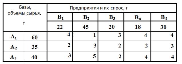 Рассмотрим применение метода потенциалов на конкретном производственном примере составления оптимального плана перевозок. Пусть имеется три оптовых базы, которые поставляют сырье для пяти производственных предприятий. Условия задачи представлены в табл.2. Себестоимость перевозки сырья представлена в условных единицах.