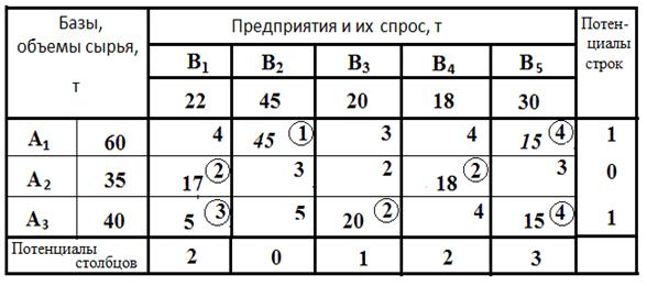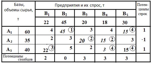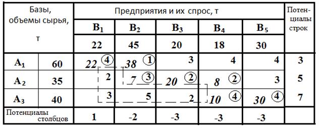 Потенциалы строк и столбцов определяются следующим образом. В табл. 3 произвольно принимается потенциал строки А1 равным 3 (может быть принято и любое другое число). В строке А1 находятся две базисные клетки, показатели Cij , которых равны 4 и 1. Тогда потенциал столбца В1 равен 4-3=1, а В2 1 – 3 = – 2. В столбце В2 находится еще одна базисная клетка, в которой Cij =3, следовательно, потенциал строки А2 равен 3 – (–2) =5, тогда потенциалы столбцов В3 и В4 равны соответственно 2 – 5 = – 3, строки А3 = 7 и столбца В5 = – 3 .