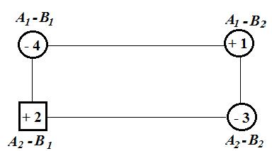 Видно, что отрицательных характеристик три: А2 - В1 , А3 - В1 и А3 – В3 . Наибольшая по абсолютной величине отрицательная характеристика в А3 - В1 , которая составляет – 5. перераспределим поставки по цепи к этой клетке. Для этого составим цепь с вершинами: А1 - В1 , А1 – В2 , А2 – В2 , А2 – В4 , , А3 – В4 ,