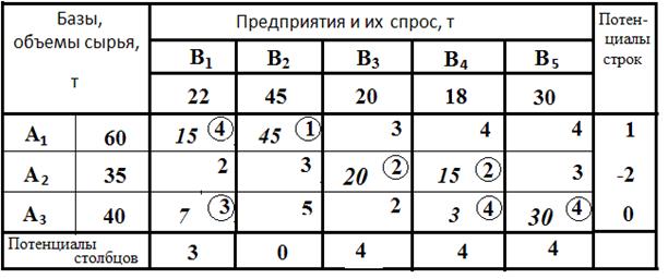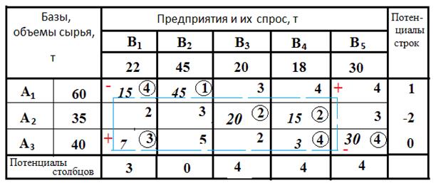 ). Прибавляем по 7 к объемам поставки в положительных вершинах и вычитаем из поставок в отрицательных также по 7. Получившийся план перевозок записываем в таблицу 4 и определяем новые потенциалы, произвольно приняв потенциал строки А1