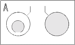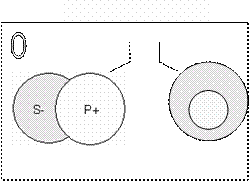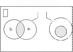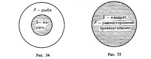 Распределенность терминов в суждениях можно иллюстрировать с помощью круговых схем Эйлера. На рис. 34 изображено соотношение S и Р в суждении А. Заштрихованная часть круга на рис. 34—39 характеризует распределенность (или нераспределенность) терминов.