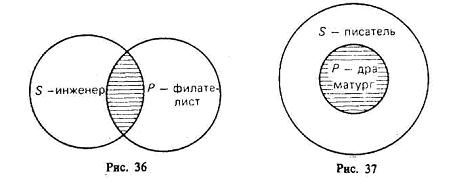 1-й случай. В суждении «Некоторые инженеры — филателисты» термины такие: S — «инженер», Р — «филателист», квантор существования — «некоторые». Соотношение S и Р изображено на рис. 36. Субъект не распределен, так как в нем мыслится только часть инженеров, т. е. объем субъекта лишь частично включается в объем предиката. Предикат тоже не распределен, так как он также лишь частично включен в объем субъекта (только некоторые филателисты являются инженерами).