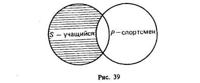 Его структура: «Некоторые S не есть Р ». Например, «Некоторые учащиеся не являются спортсменами». В нем такие термины: S — «учащийся», Р — «спортсмен», квантор существования — «некоторые». Субъект не распределен, так как мыслится лишь часть учащихся, а предикат распределен, ибо в нем мыслятся все спортсмены, ни один из которых не включен в ту часть учащихся, которая мыслится в субъекте (рис. 39).
