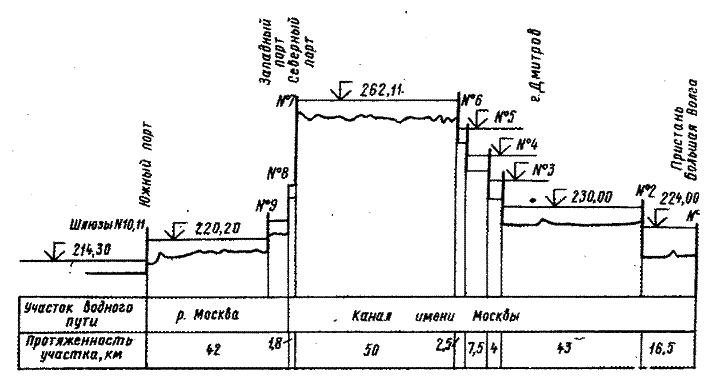 Общая протяженность судоходно-водоводного канала от Волги до р. Москвы 128 км. Наряду со сравнительно-незначительными выемками на канале есть участки, где глубина выемки достигает 15—15 км, а на перевальной глубокой выемке даже 23,5 м при ширине поверху до 140 м. В нижней части последней выемки, проходящей в суглинках с песчаными прослойками, на 112-м километре канала был встречен водоносный слой, способствующий образованию оползней. Для обеспечения возможности ремонта этот ответственный участок канала с обеих сторон огражден специальными заградительными (ремонтными) воротами, позволяющими в случае необходимости быстро осушить этот участок.