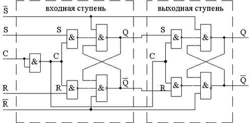 Триггеры со сложной логикой бывают также одно- и двухступенчатые. В этих триггерах наряду с синхронными сигналами присутствуют и асинхронные. Такой триггер изображён на рис. 5, верхний (S) и нижний (R) входные сигналы являются асинхронными.