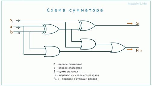 Сумматор – логический операционный узел, выполняющий арифметическое сложение кодов двух чисел. При арифметическом сложении выполняются и другие дополнительные операции: учет знаков чисел, выравнивание порядков слагаемых и тому подобное. Указанные операции выполняются в арифметическо-логических устройствах (АЛУ) или процессорных элементах, ядром которых являются сумматоры.