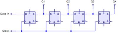 Рис. 10. 4-х разрядный сдвиговый регистр, преобразователь последовательного кода в параллельный и обратно