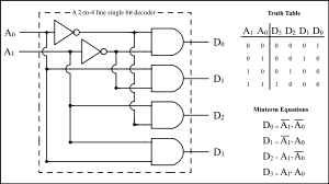Дешифраторы - это комбинационные схемы с несколькими входами и выходами, преобразующие код, подаваемый на входы в сигнал на одном из выходов. На выходе дешифратора появляется логическая единица, на остальных — логические нули, когда на входных шинах устанавливается двоичный код определённого числа или символа, то есть дешифратор расшифровывает число в двоичном, троичном или k-ичном коде, представляя его логической единицей на определённом выходе. Число входов дешифратора равно количеству разрядов поступающих двоичных, троичных или k-ичных чисел. Число выходов равно полному количеству различных двоичных, троичных или k-ичных чисел этой разрядности.