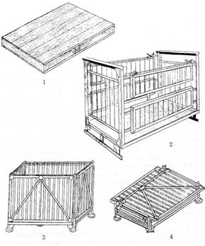 Рис. Поддоны:1 — плоский деревянный; 2 — стоечный; 3 — ящичный; 4 — ящичный в сложенном виде