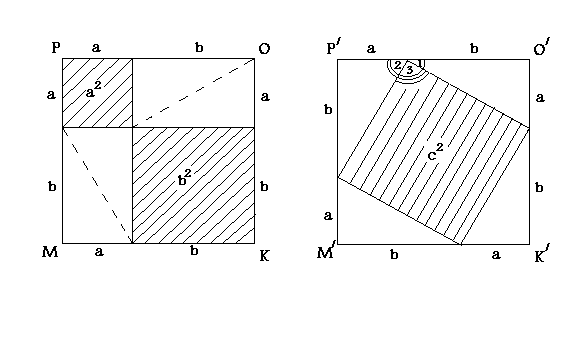 "...Сумма площадей квадратов, построенных на катетах (на чертеже 2 эти квадраты заштрихованы), равна площади квадрата МКОР без суммы площадей четырех равных треугольников, а площадь квадрата, построенного на гипотенузе ( на чертеже 3 этот квадрат тоже заштрихован), равна площади квадрата М'К'О'Р', равного квадрату МКОР..."[10.116].