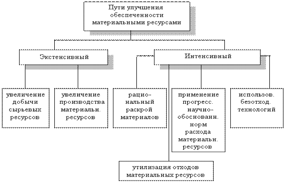 Удовлетворение потребности предприятия в материальных ресурсах может обеспечиваться двумя путями: экстенсивным и интенсивным .Экстенсивный путь предполагает увеличение добычи и производства материальных ресурсов и связан с дополнительными затратами. Кроме того, рост объема производства при существующих технологических системах привел к тому, что темпы истощения природных ресурсов и уровень загрязнения окружающей среды вышли за допустимые пределы. Поэтому рост потребности предприятия в материальных ресурсах должен осуществляться за счет более экономного их использования в процессе производства продукции интенсивным путем.
