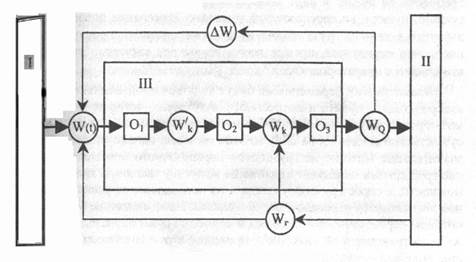 Здесь обозначено: I – грузообразующий пункт; II – грузопоглащающий пункт; III – перевозочный комплекс; W(t) – грузопоток перевозочного комплекса; WQ – транспортная продукция; Wг – потребности грузополучателя; W’k – плановая провозная возможность перевозочного комплекса; Wk - фактическая провозная возможность перевозочного комплекса; О1 ,О2 ,О3 - операторы.