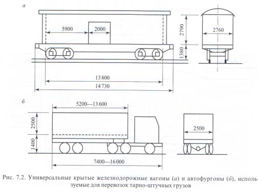 Большинство тарно-штучных грузов перевозят в крытом подвижном составе железнодорожного и автомобильного транспорта, так как в соответствии с техническими условиями они должны быть защищены при транспортировке от воздействия погодных условий. Схемы и характеристика подвижного состава для перевозки тарно-штучных грузов показаны на рис. 7.2.