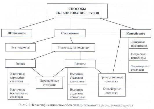 Способы складирования тарно-штучных грузов очень разнообразны. Под этим понятием подразумевается сочетание вида хранения (штабельное или стеллажное), типа и параметров грузовой транспортно-складской единицы, стеллажей и штабелирующего оборудования. Классификация способов складирования тарно-штучных грузов приведена на рис. 7.3. Кроме показанных на схеме способов складирования, возможно еще хранение мелких штучных грузов без поддонов в выдвижных ящиках стеллажей.