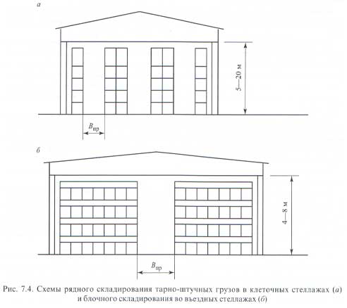 Стеллажные системы, применяемые на современных складах, тоже очень разнообразны. Это разнообразие обусловлено стремлением, во-первых, добиться максимального заполнения объемов складов грузами и, во-вторых, обеспечить минимальные затраты и максимальную производительность на приеме и выдаче грузов со складов. Для этого применяют две основных системы стеллажного складирования грузов: рядное складирование с использованием клеточных стеллажей (рис. 7.4, а) и блочное складирование на стеллажах различных специальных конструкций (рис. 7.4, б).