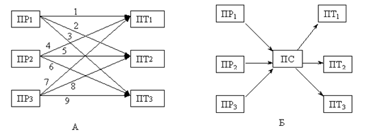 В части А показаны три производителя, которые используют прямые каналы товародвижения к трем потребителям. Такая система предполагает девять различных контактов производителей с потребителями. В части Б показано, как три производителя действуют через одного посредника, который взаимодействует с тремя потребителями. Эта схема предполагает всего шесть контактов. Таким образом, количество взаимосвязей уменьшается на одну треть, что в условиях большого числа связей чрезвычайно важно.