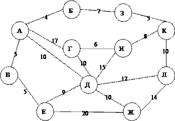 На схеме (рис.1)находится наименьшее звено. В данном случае это звено А-Б = 4 км . Затем рассматриваются все звенья, связанные одной из своих вершин с выбранным звеном, т.е. звенья: А-В = 5км , Б-З = 7 км . Из них выбирается звено с наименьшим расстоянием (А - В = 5 км ). Далее рассматриваются все звенья, связанные с вершинами полученной ломаной линии Б-А-В, из них выбирается наименьшее, и так до тех пор, пока не будут выбраны все вершины сети. При этом нельзя выбирать звено, соединяющее две ранее включенные в сеть вершины. На рис. 2 представлена кратчайшая связывающая сеть.