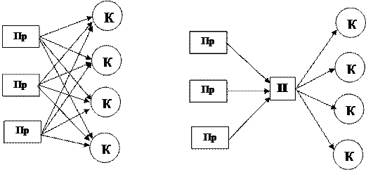Рис. 2. Схема организации сервиса индивидуальная (А), с посредником-экспедитором (Б): Пр – производитель, К – клиент, П – посредник.