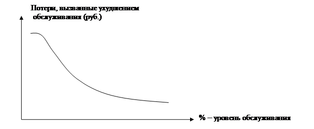 Для определения оптимального уровня обслуживания осуществляется своеобразная балансировка расходов, доходов и прибыли, реализуется принцип компромиссного решения, при котором фирмы прилагают усилия, чтобы достигнуть наилучшего соотношения между ценами и уровнем обслуживания, между расходами и доходами. По существу, эта процедура сводится к тому, что сопоставляются затраты, связанные с увеличением уровня обслуживания, с потерями доходов на рынке продажи, которые растут при уменьшении числа услуг. В итоге балансировки находится некоторый оптимум уровня обслуживания. Клиент несет потери в зависимости от уровня обслуживания.