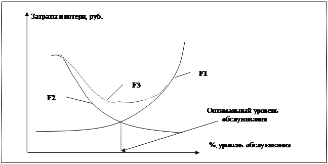 Графически оптимальный размер уровня сервиса можно определить, построив суммарную кривую F3, отражающую поведение затрат и потерь в зависимости от изменения уровня обслуживания. График функции F3 получен суммированием функций F1 и F2.