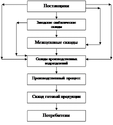 Как видно из рис.2, поставщики доставляют материальные ресурсы, необходимые производству, на заводские снабженческие склады (как правило, значительную их часть). Одновременно поставщики могут обеспечивать материальными ресурсами межцеховые склады и напрямую – склады производственных подразделений. Заводские снабженческие склады обеспечивают материальными ресурсами межцеховые склады и склады цехов. Каждый из межцеховых складов распределяет материальные ресурсы по конкретным производственным подразделениям. Таким образом, производство (цеховые склады) обеспечиваются материальными ресурсами по транзитным поставкам (от поставщиков) и по складской форме снабжения – с заводских и межцеховых складов.
