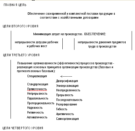 Третий уровень целей, как нам представляется, должен быть на правлен на повышение организованности (эффективности) процес сов производства, т. е. на реализацию основных и противоположных принципов организации производства, на основе которых осуществляется рационализация построения и организации гибкого (адап тивного) функционирования и развития ПС.