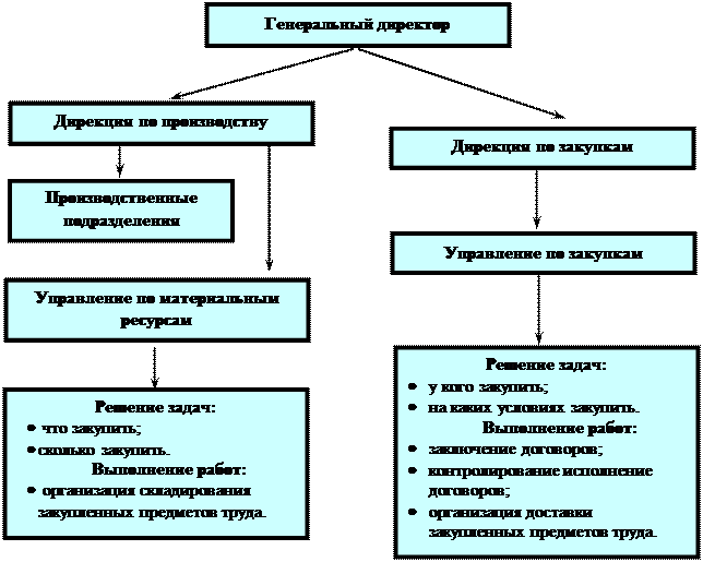 На рис.1 представлен вариант организационной структуры предприятия с распределением перечисленных выше задач между различными функциональными подразделениями. Как видим, задачи «что закупить» и «сколько закупить» решаются дирекцией по производству. Здесь же выполняются и работы по складированию закупленных предметов труда.