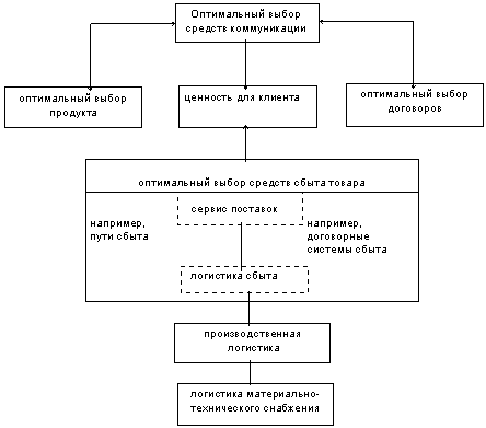 Многообразные отношения обмена между отдельными рынками, комбинационные эффекты, синергии и т. п. не допускают в связи с этим изолированную оценку определенных логистически признаков услуг. Общим местом сопряжения ориентированной на комплексность концепции логистики и ориентированной на рынок концепции маркетинга является маркетинговая логистика. Для того, чтобы потенциал логистики как стратегический фактор успеха можно было использовать, требуется включение или сведение вместе обеих концепций в одну обобщенную конкурентно-стратегическую концепцию. В ней сервис поставок, как выход логистики, занимает равноправное место наряду с остальными инструментами маркетинга. При определении собственной позиции в конкуренции логистика становится неотъемлемой составной частью концепции конкуренции.