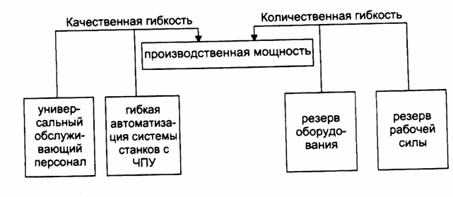 Запас производственной мощности возникает при наличии качественной и количественной гибкости производственных систем. Качественная гибкость обеспечивается за счет наличия универсального обслуживающего персонала и гибкого производства. Количественная гибкость может обеспечиваться различными способами. Например, на некоторых предприятиях Японии основной персонал составляет не более 20% от максимальной численности работающих. Остальные 80% — временные работники. Таким образом, при численности персонала в 200 человек предприятие в любой момент может поставить на выполнение заказа до 1000 человек. Резерв рабочей силы должен дополняться соответствующим резервом средств труда (рис. 29).