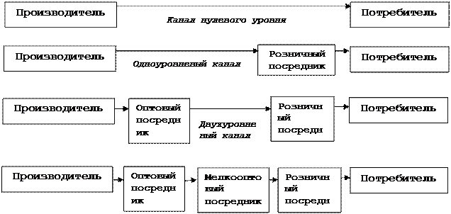 Каналы распределения товаров можно охарактеризовать по числу составляющих их уровней. Уровень канала — это посредник, который выполняет работу по приближению товара и права собственности на него к конечному потребителю. Протяженность канала определяется по числу промежуточных уровней между производителем и потребителем, которые, как и уровни канала, являются членами канала распределения. Примеры каналов распределения различной протяженности приведены на рис. 1. Такие каналы распределения называются горизонтальными .