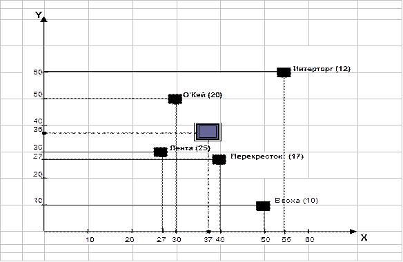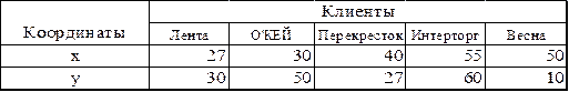 Для этого используется метод наложения сетки координат на карту потенциальных мест расположения складов. Этот метод подходит для определения месторасположения склада при условии развитой сети дорог.Для применения этого метода необходимы координаты и грузооборот потребителей. Возьмунаших основных клиентов и их средние отгрузки в месяц, в скобках указаны их координаты: