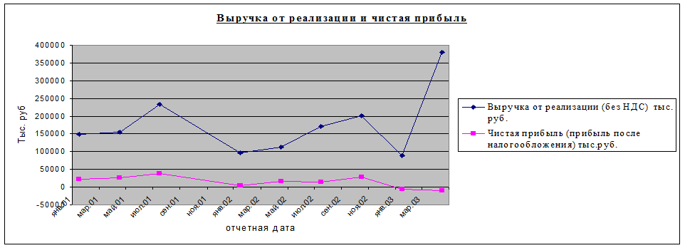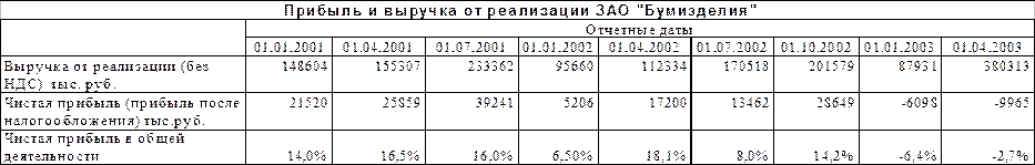В табл.1.1 и на рис 1.1 показана динамика изменения чистой прибыли и выручки ЗАО «Бумизделия». Несмотря на рост выручки, прибыль имеет тенденцию к снижению - на 01.04.03 убыток составил 9965 тыс. руб., что говорит о росте себестоимости продукции.
