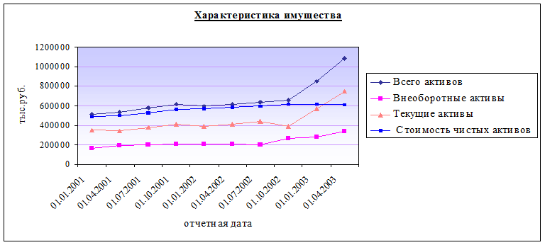 В таблице 1.2 и на диаграмме 1.2 представлено изменение активов объекта анализа. Нельзя не заметить рост активов предприятия в 2003 г., что выглядит достаточно странно в условиях убытка, отмеченного в том же периоде. Общий анализ позволяет сделать вывод о тенденции ухудшения финансового состояния предприятия с 2002 по 2003 год.