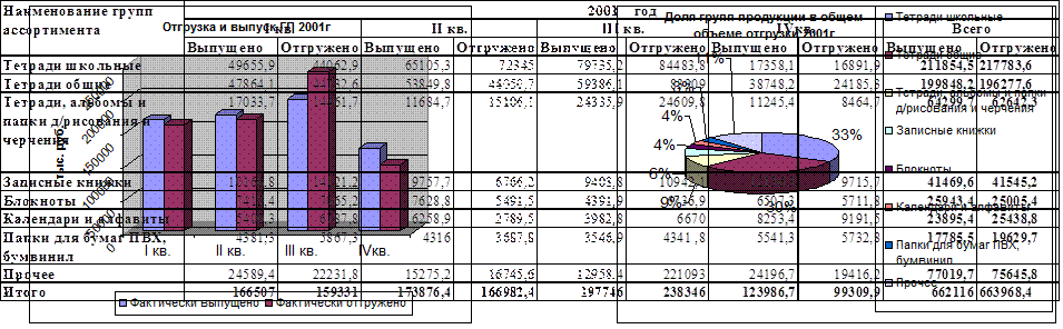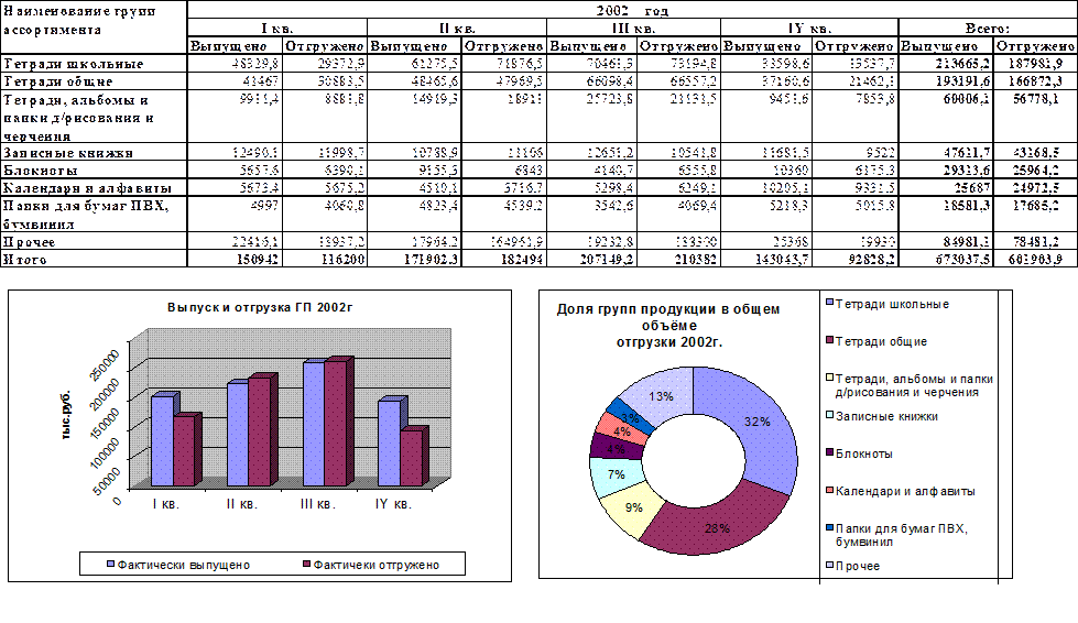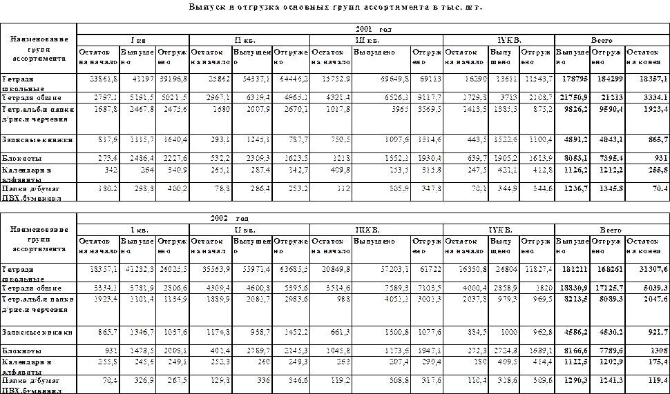 В таблицах 1.3, 1.4 и на рисунках 1.3, 1.5 представлена динамика стоимостного объема реализации в стоимостном выражении за 2001 и 2002 гг. соответственно по группам продукции. На рисунках 1.4 и 1.5 показана доля каждой группы в общем объеме годовой отгрузки. Таблицы 1.5-1.8 содержат собой данные об отгрузке в натуральных показателях.