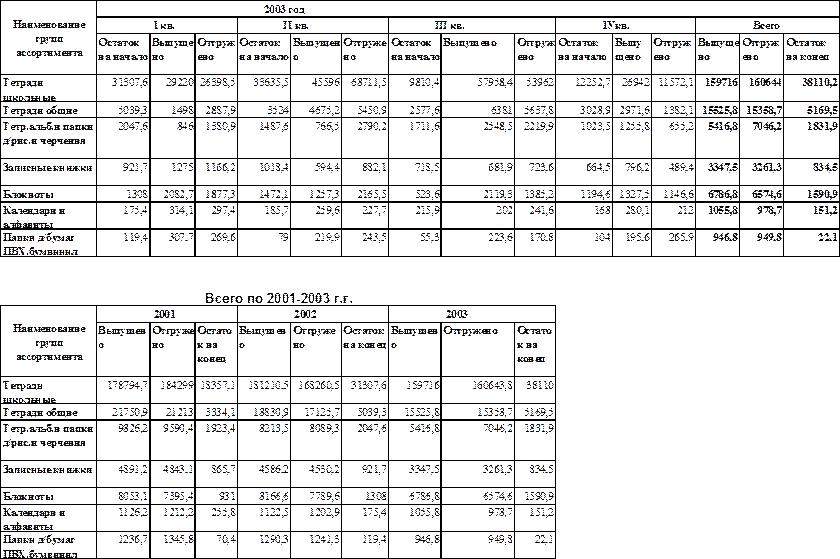 3. Данные об отгрузке и производстве продукции ЗАО «Бумизделия» по группам за 2001-2003 гг.