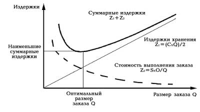 Из приведенной формулы видно, что при неизменном объеме производственного потребления и средней стоимости размещения одного заказа общая сумма операционных затрат по размещению заказов минимизируется с ростом среднего размера одной партии поставки товаров.
