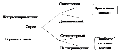 Модель управления запасами должна дать ответ на два вопроса: сколько продукции заказывать и когда заказывать. Однако в действительности имеется значительное число моделей управления запасами, для решения которых используется разнообразный математический аппарат - от простых схем анализа до сложных алгоритмов математического программирования. Такое явление объясняется различным характером спроса (расходования продукции), который может быть детерминированным (достоверным) или вероятностным. В свою очередь детерминированный спрос может быть статическим, когда интенсивность потребления не меняется во времени, или динамическим, когда достоверный спрос изменяется в зависимости от времени. Вероятностный спрос может быть стационарным, когда плотность вероятности спроса не изменяется во времени, и нестационарным, когда функция плотности вероятности спроса изменяется в зависимости от времени.