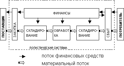 Границы логиститческой системы определяются производственным циклом, начиная от организации производства и заканчивая доставкой готовой продукции потребителю. Организация производственного процесса начинается с закупки необходимых средств производства. Они поступают в логистическую систему, складируются, обрабатываются, вновь хранятся и затем уходят из логистической системы в потребление в обмен на поступающие в логистическую систему финансовые ресурсы (рис.2.).