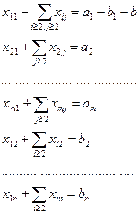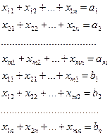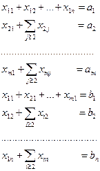 остальных уравнений (“вертикальные” уравнения). В каждом из горизонтальных уравнений содержатся неизвестные с одним и тем же первым индексом (они образуют одну строку матрицы перевозок), в каждом из вертикальных уравнений содержатся неизвестные с одним и тем же вторым индексом (они образуют один столбец матрицы перевозок). Таким образом, каждая неизвестная встречается в системе (2.1) дважды: в одном и только одном горизонтальном и в одном и только одном вертикальном уравнениях.