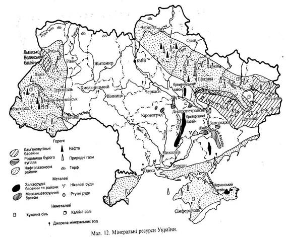 В структурі топливних ресурсів України домінує кам’яне і буре вугілля, запаси якого за категоріями А+В+С станом на 1997р. складають 45,7 млрд.т і є цілком достатніми для забезпечення власних потреб. Основні запаси кам’яного вугілля зосередженні в Донецькому і Львівсько-Волинському басейнах; бурого вугілля-переважно в Дніпровському басейні.