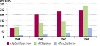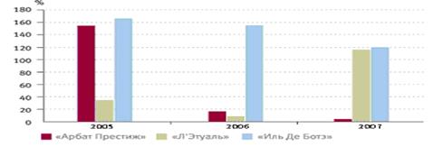 Рис. 7. Рост продаж крупных розничных сетей парфюмерии и косметики, 2005–2007 гг.
