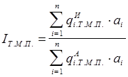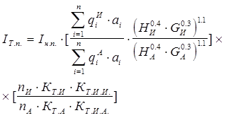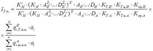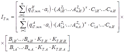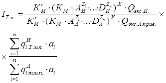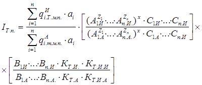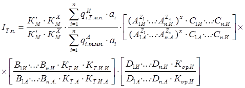 Выражение, заключенное в первые квадратные скобки, уравнения (3.21) состоит из показателей назначения машин, а во вторых – соотношение показателей технического уровня. С целью проведения подробного анализа производимого кранового оборудования АО «НКМЗ» необходимо произвести разделение комплексного показателя конкурентоспособности на групповые показатели по техническим и экономическим параметрам и осуществить поэтапный расчет. Тогда первый показатель для данного типа машин можно представить в следующем виде: