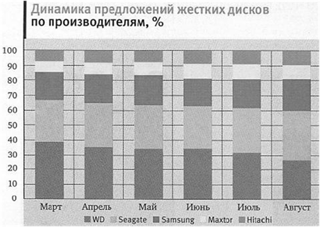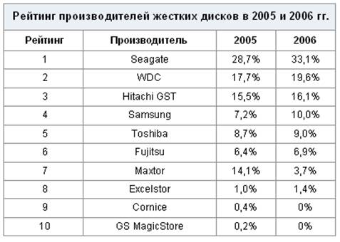 Лидером среди поставщиков накопителей на жестких дисках остается компания Seagate, еще более укрепившая позиции в 2006 году, во многом благодаря приобретению другого крупного производителя, компании Maxtor. Удельный вес продуктов компании Seagate в прошлом году составил 33,1%. Второе и третье место, сохранив свои позиции с 2006 года, занимают компании Western Digital и Hitachi GST c 19,6% и 16,1% рынка, соответственно. Следом за ними идут обменявшиеся строчками рейтинга компании Samsung (10,0%) и Toshiba (9,0%); еще один крупный производитель жестких дисков, компания Fujitsu, с 6,9% рынка осталась на шестом месте. [1]